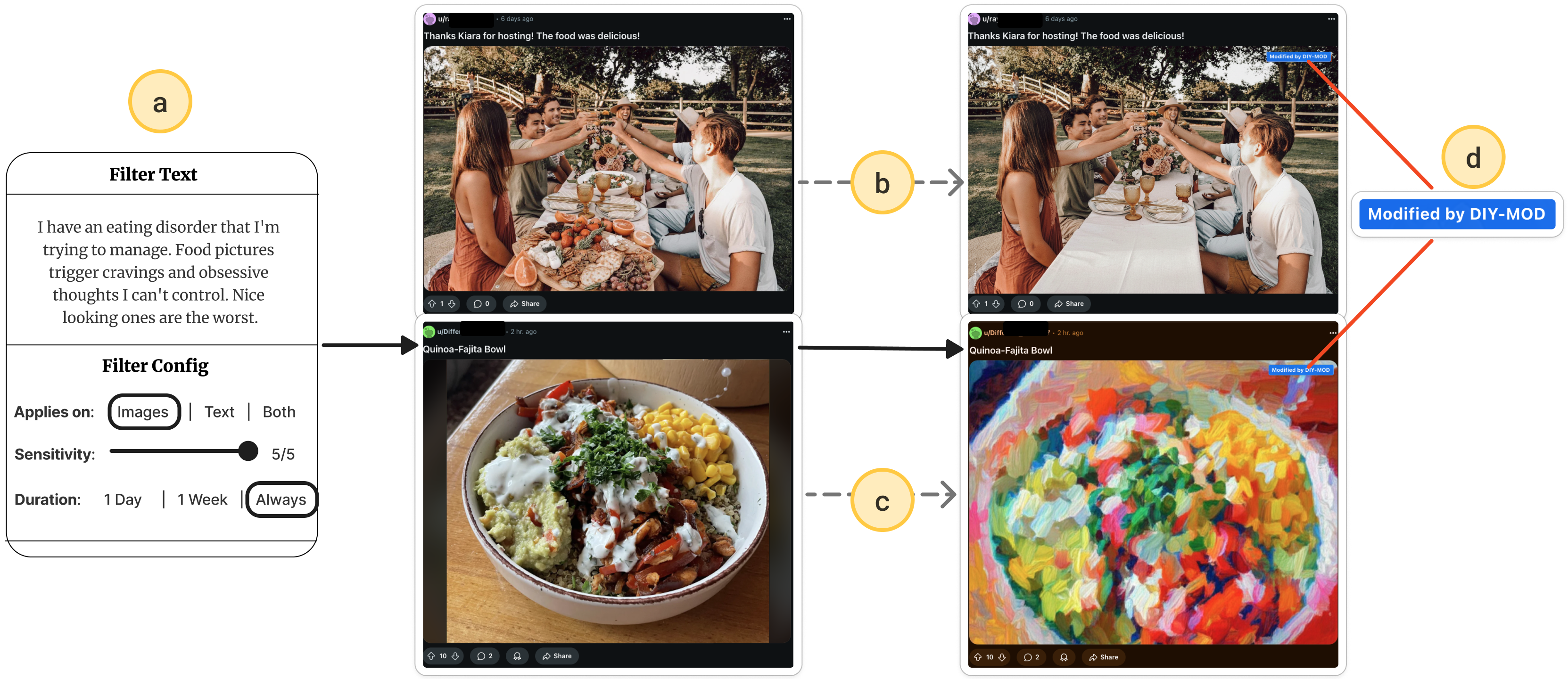 Platforms define harm universally and respond with suppression. What if users could define harm themselves? We built DIY-MOD, a system with optimized LVLM pipelines that transforms user-defined harmful elements within content in real-time instead of removing the entire post. (CHI 2026, under review)